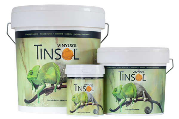 Tinta plástica acetinada ou mate base aquosa para interiores, lavável, com rendimento de 10 a 12 m² por litro e acabamento liso.